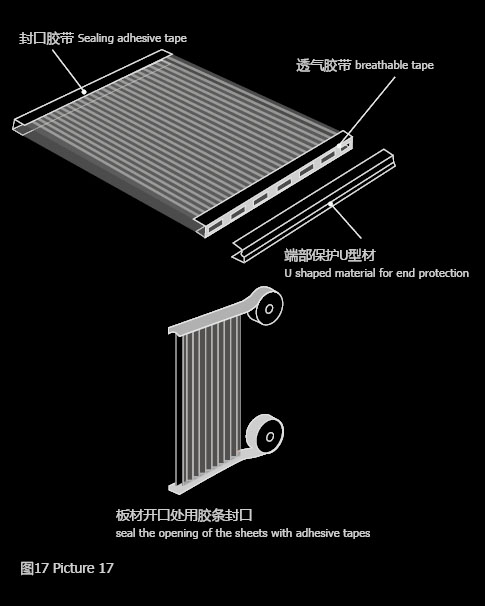 D.確保根據(jù)具體應(yīng)用情況使用適當(dāng)?shù)姆饪谀z帶,注意:在彎曲安裝的情況下,因?yàn)榘宀膬啥碎_口均向下所以兩端都使用專用透氣膠帶封口。注意對(duì)端部封口膠帶的保護(hù),避免在安裝型材時(shí)損壞,可以采用聚碳酸酯U型材進(jìn)行保護(hù) (圖一17C)