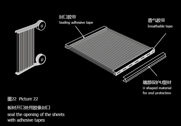 *使用鋁箔膠帶和專用透氣膠帶對板材孔格端部進(jìn)行封口處理,這兩種膠帶可以從有實力的膠帶生產(chǎn)商處獲得。(見圖22)