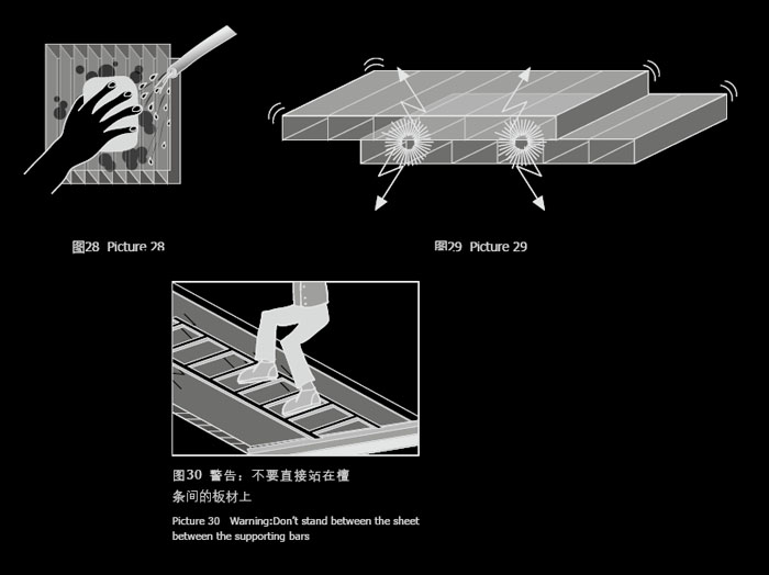 1. 安裝或維護(hù)中空板材時(shí),要注意板材不適于承受一個(gè)人重量的集中荷載當(dāng)在任何種類采光屋面上工作時(shí),建議使用梯子或防滑踏板。
